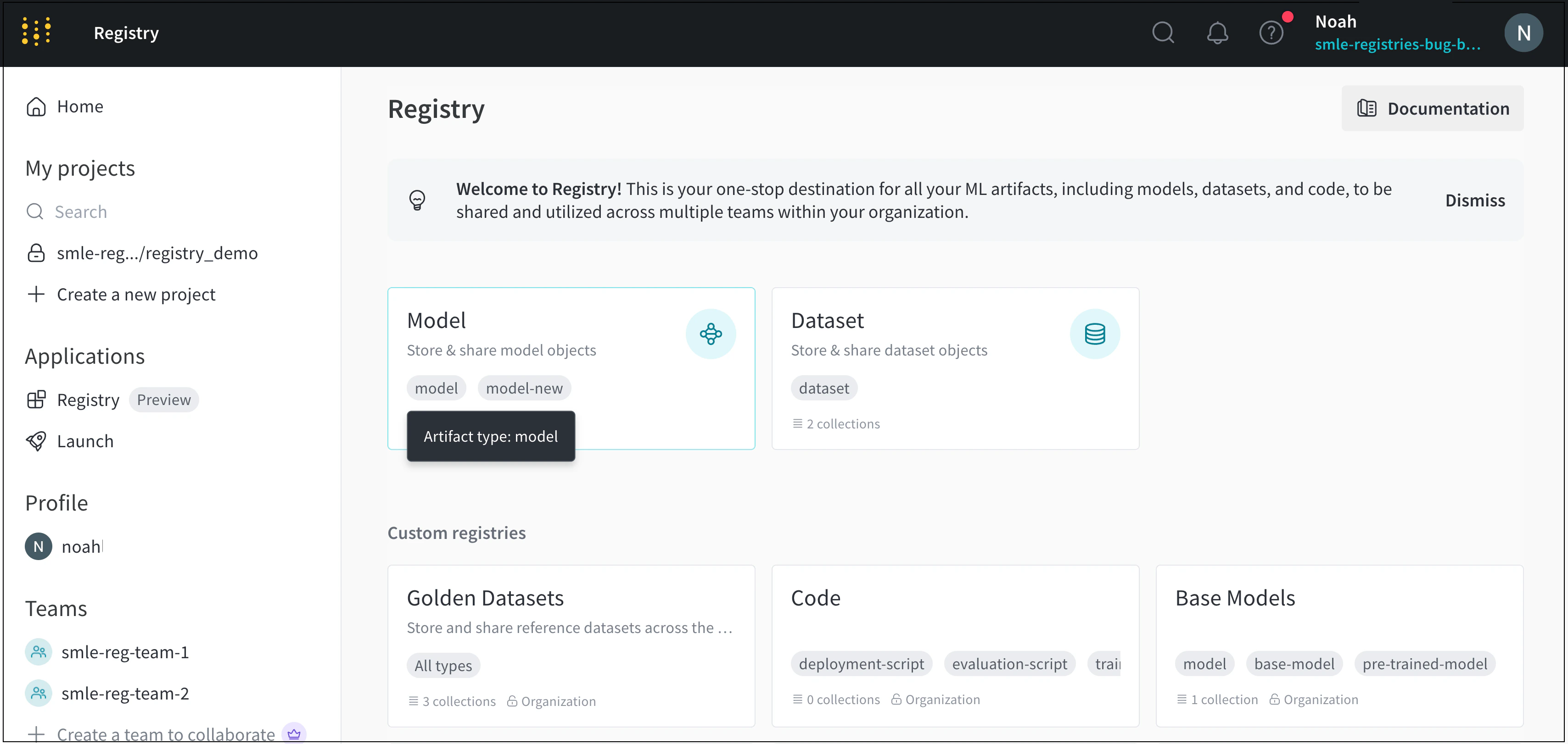 홈페이지의 레지스트리 카드 또는 레지스트리의 설정 페이지에서 허용되는 아티팩트 유형을 찾을 수 있습니다.두 방법 모두 먼저 W&B 레지스트리 App으로 이동합니다.레지스트리 App의 홈페이지 내에서 해당 레지스트리의 레지스트리 카드로 스크롤하여 허용되는 아티팩트 유형을 볼 수 있습니다. 레지스트리 카드 내의 회색 가로 타원은 해당 레지스트리가 허용하는 아티팩트 유형을 나열합니다.